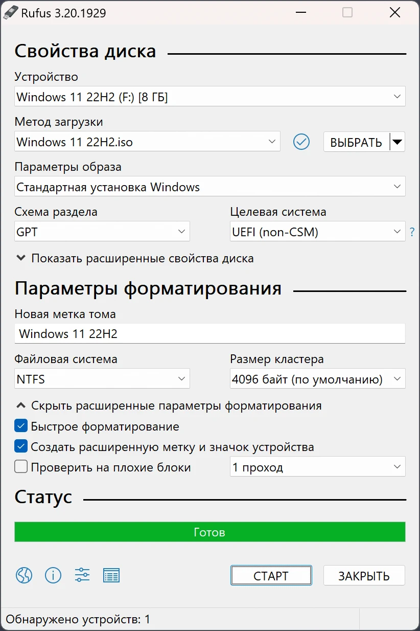 - ⚙️ Настройте параметры (если требуется): схема разделов (MBR / GPT), файловая система, метка тома. По умолчанию Rufus выставляет подходящие значения.